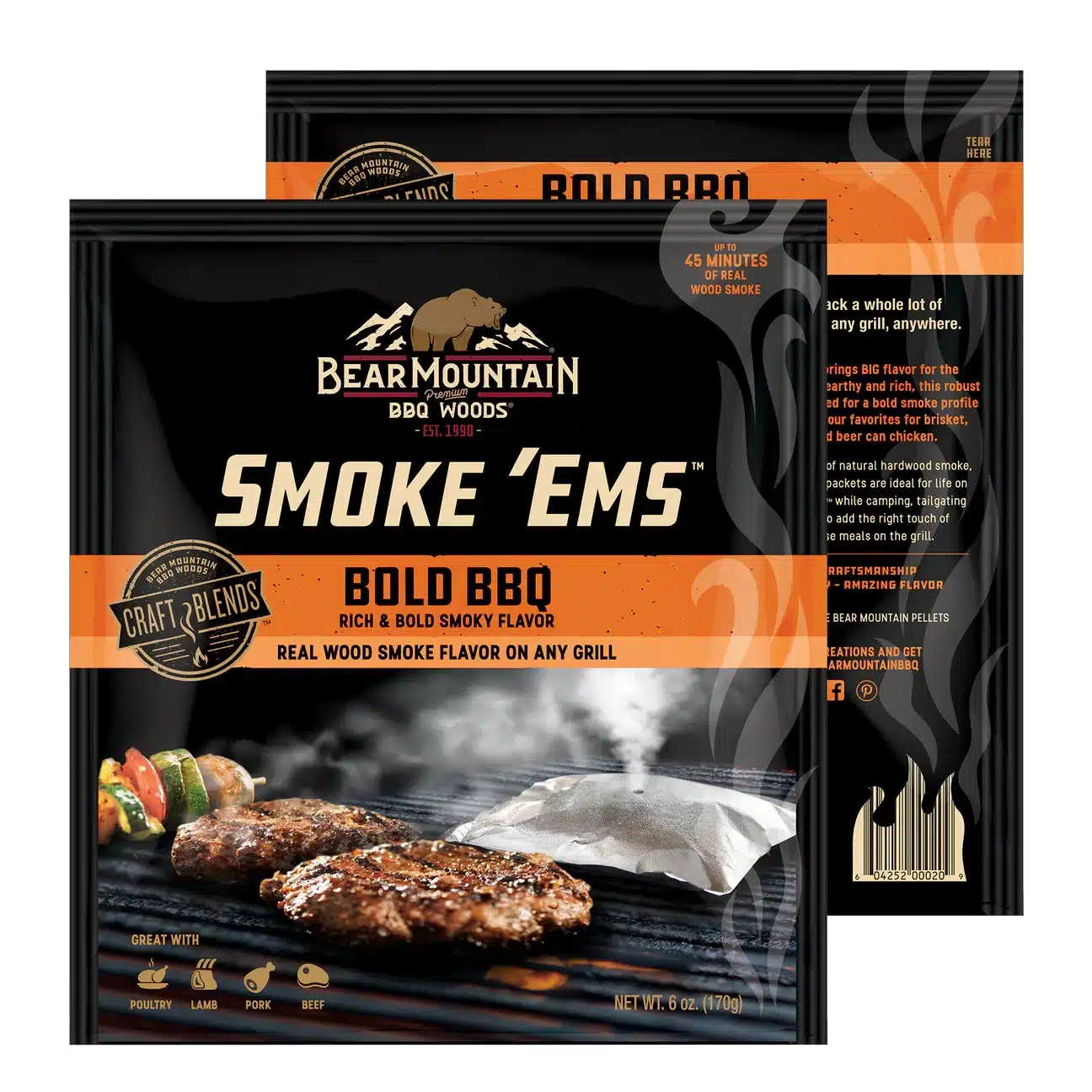 The easiest way to add wood smoke flavor to your backyard grilling. Our Bear Mountain Bold BBQ Blend brings BIG flavor for the boldest of eats, on any grill. Smoky, earthy, and rich, this robust hardwood blend is crafted for a bold smoke profile with a bite. It’s one of our favorites for beef, pork and beer can chicken. Available in 4-packs of 6 oz bags.